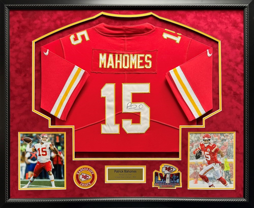 Own a piece of football history with this framed, authenticated signed Chiefs jersey from Super Bowl MVP Patrick Mahomes! As the dynamic quarterback who led Kansas City to three Super Bowl victories, Mahomes has solidified his legacy as one of the NFL’s greatest. This stunning display features his autograph, action-packed photos from his 3rd Super Bowl MVP performance, and a custom plaque commemorating his incredible achievements. A must-have for any Chiefs fan or sports collector, this one-of-a-kind piece is a perfect centerpiece to celebrate the greatness of Mahomes!