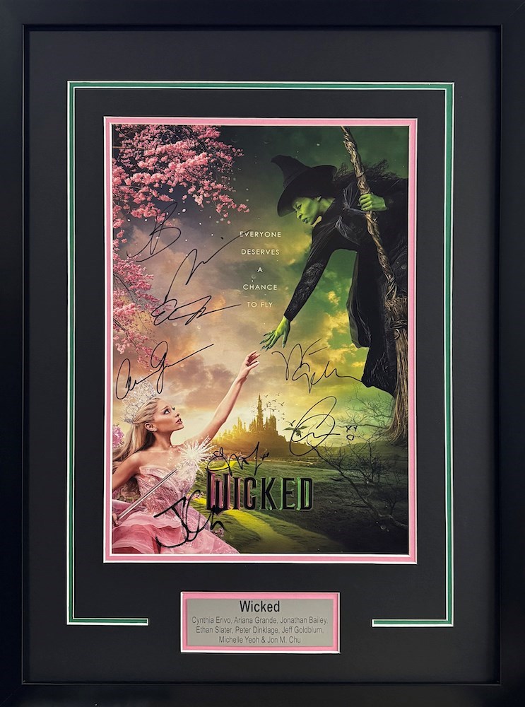 Step into the magic of Wicked, the cinematic sensation that’s redefining the world of Oz! This exclusive 13x19 framed poster, signed by the film’s all-star cast—including Cynthia Erivo, Ariana Grande, Jonathan Bailey, Ethan Slater, Peter Dinklage, Jeff Goldblum, Michelle Yeoh, and director Jon M. Chu—is a must-have for any fan. Perfectly preserved and elegantly displayed, this collector’s piece captures the spellbinding essence of the movie while celebrating the talent behind it. Whether you're a Broadway enthusiast, a movie buff, or simply love the world of Wicked, this rare treasure is your chance to own a piece of cinematic history! Bid now and bring a little Oz home with you!