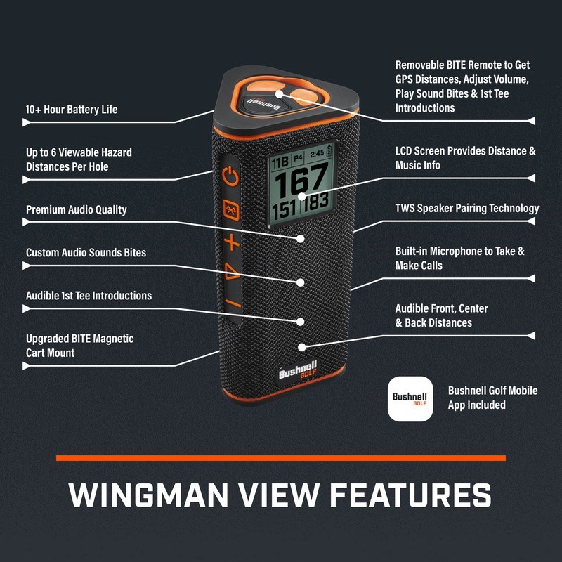 The Wingman View allows you to listen to your favorite tunes and get both audible and visual distances around the course. It features high-quality audio combined with a viewable LCD screen that provides distance and music information.