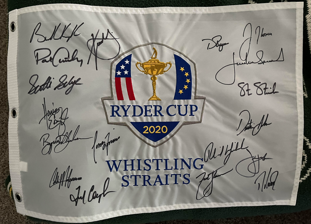 United States team signed pin flag from the 2020 Ryder Cup! with a 19-9 win over Team Europe, this marked the largest victory margin for the U.S. in Ryder Cup history.