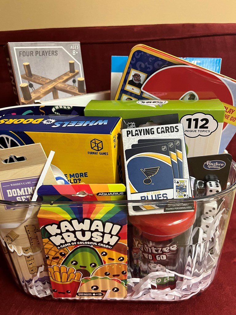 Gather for endless fun with this basket, featuring unique games that aren’t already in your closet to make the perfect friend or family game night! Games include: Beat the Parents, The Game of THINGS, Wheels vs Doors, Guess Who, What Do You MEME?, Ring Toss, Yahtzee, to go, Kawaii Krush, Dominos, No Wi-Fi Activity Book, Charades for the Family, and a St. Louis Blues Deck of Cards.