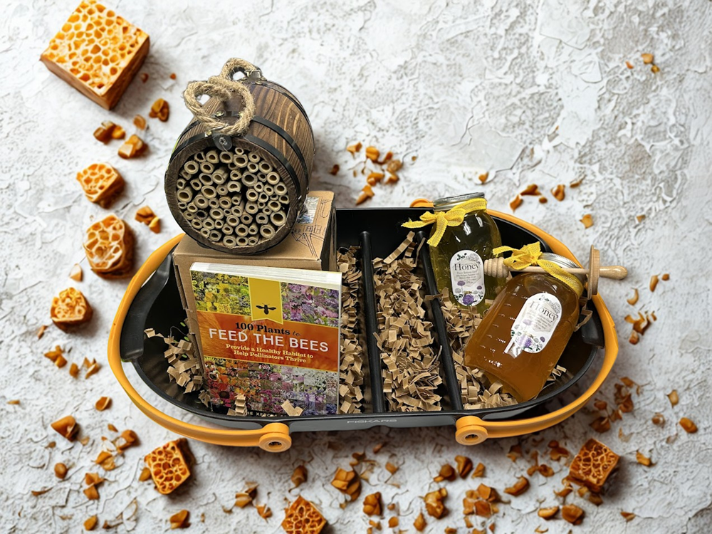 Celebrate nature and support our buzzing friends with this charming bee-themed basket! Perfect for gardeners and nature lovers, this basket includes: -Two jars of honey from Fuzzy Bottom Girls -“100 Plants to Feed the Bees” book -Fiskars 24-inch Garden Harvest Basket -Wooden Bee Pollinator A delightful way to bring beauty to your garden while helping pollinators thrive!