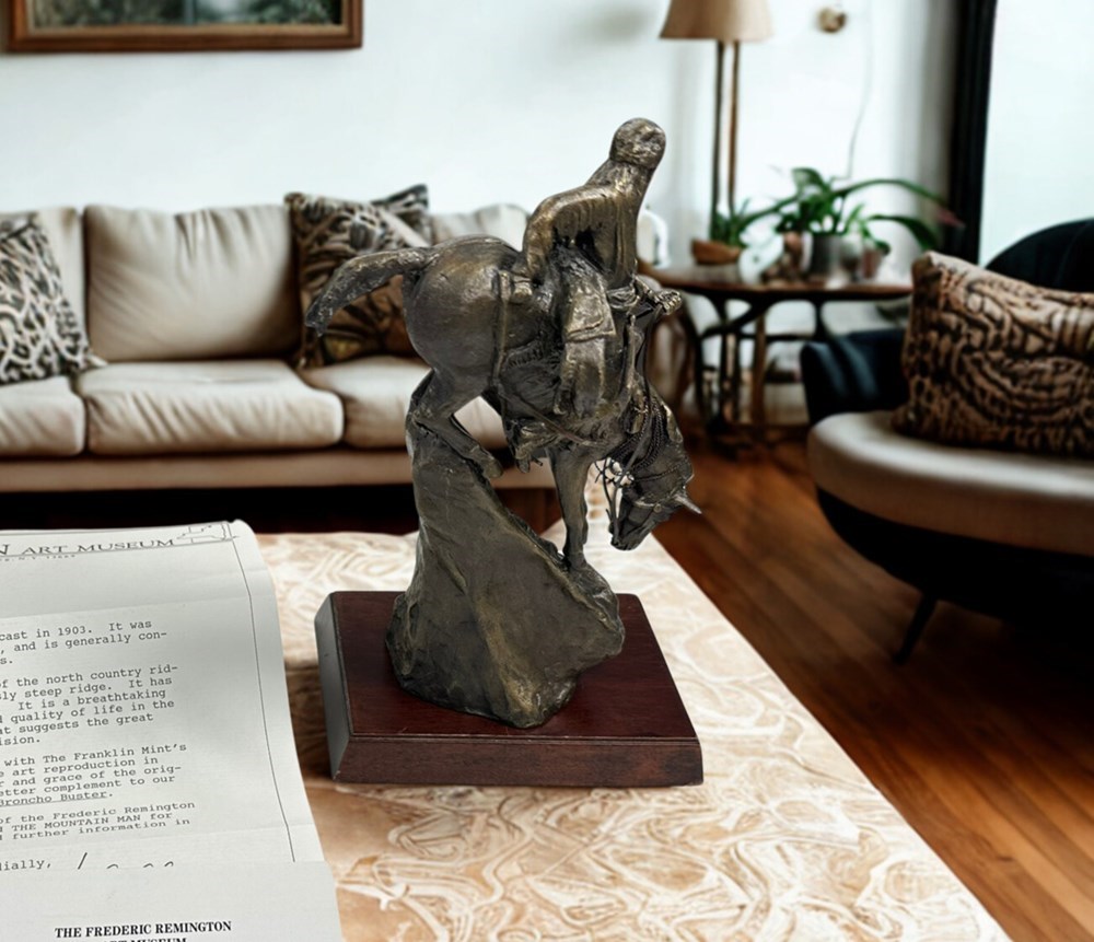 The MOUNTAIN MAN was first cast in 1903 and was among Frederick Remington's finest bronzes and is generally considered one of his most ambitious. The Franklin Mint's spirited recreation is a fine art reproduction in miniature that captures all the power and grace of the original. The statue portrays a fur trapper of the north country riding his mount down a treacherously steep ridge. It evokes the rugged quality of life in the great American West, and one that suggest the great range or Reminton's artistic vision.