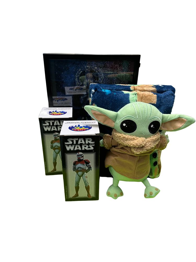 Star Wars fan favorites: -Handmade diamond painting of Darth Vader -Baby Yoda Blanket & Plush -Cincinnati Reds Storm Trooper Bobbleheads