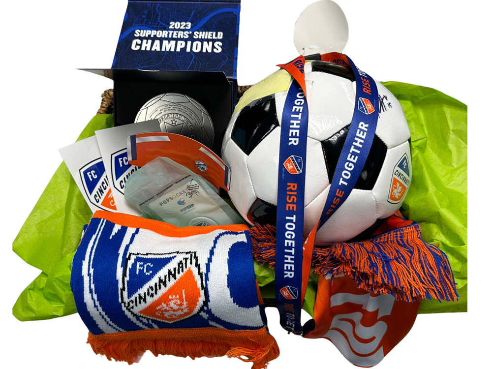 Show your team spirit with this ultimate FC Cincinnati fan bundle: -Signed FC Cincinnati Soccer Ball – a must-have collectible for any supporter. -Lanyards & Scarves – wear your pride on game days or every day. -Pop Sockets, Magnets & Stickers – add a touch of FC Cincinnati flair to your phone, fridge, and more. Bid now and score big with this collection of fan favorites!