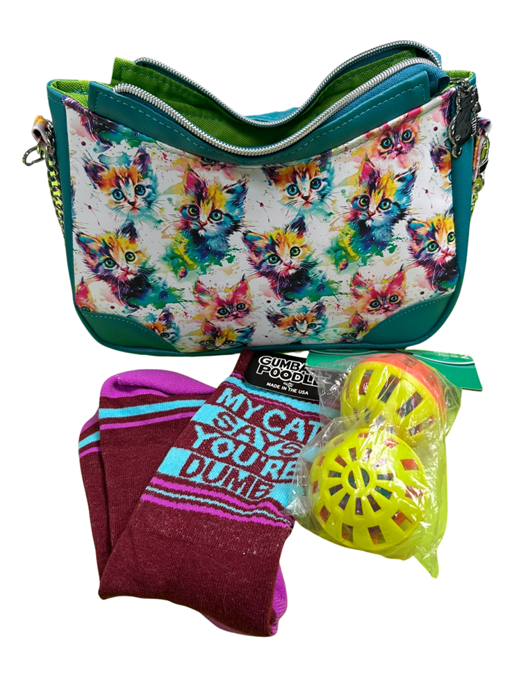 This bright and colorful, handmade purse by Cherries Please on Etsy is perfect for cat lovers! And these socks let us know how our cats really feel!!