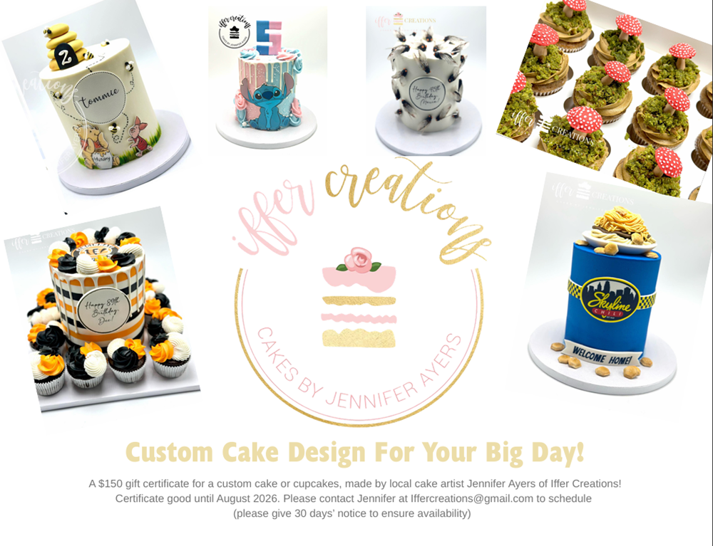 $150 gift certificate towards a custom cake or cupcakes, made by local cake artist Jennifer Ayers of Iffer Creations. Certificate good until August 2026.