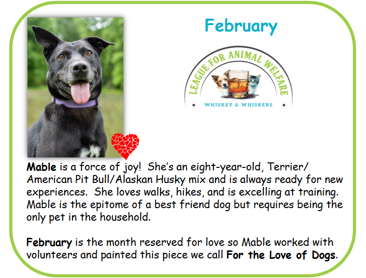 Mable is a force of joy! She’s an eight-year-old, Terrier/ American Pit Bull/Alaskan Husky mix and is always ready for new experiences. She loves walks, hikes, and is excelling at training. Mable is the epitome of a best friend dog but requires being the only pet in the household. February is the month reserved for love, so Mable worked with volunteers and painted this piece we call For the Love of Dogs.
