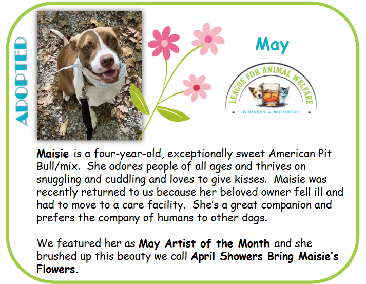 Maisie is a four-year-old, exceptionally sweet American Pit Bull/mix. She adores people of all ages and thrives on snuggling and cuddling and loves to give kisses. Maisie was recently returned to us because her beloved owner fell ill and had to move to a care facility. She’s a great companion and prefers the company of humans to other dogs. **Adopted** We featured her as May Artist of the Month and she brushed up this beauty we call April Showers Bring Maisie’s Flowers.