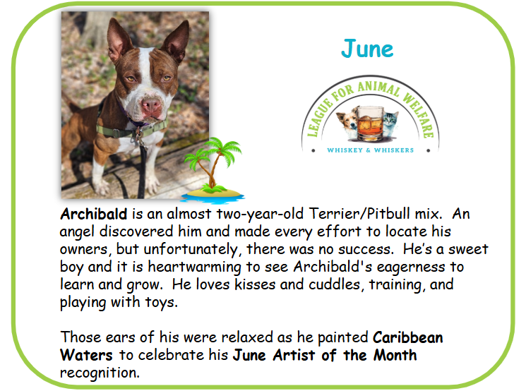 Archibald is an almost two-year-old Terrier/Pit Bull mix. An angel discovered him and made every effort to locate his owners, but unfortunately, there was no success. He’s a sweet boy and it is heartwarming to see Archibald's eagerness to learn and grow. He loves kisses and cuddles, training, and playing with toys. Those ears of his were relaxed as he painted Caribbean Waters to celebrate his June Artist of the Month recognition.