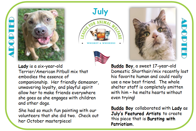 Lady is a six-year-old Terrier/American Pitbull mix that embodies the essence of companionship. Her friendly demeanor, unwavering loyalty, and playful spirit allow her to make friends everywhere she goes as she engages with children and other dogs. She had so much fun painting with our volunteers that she did two. Check out her October masterpiece! Budda Boy, a sweet 17-year-old Domestic Shorthair/mix recently lost his favorite human and could really use a new best friend. The whole shelter staff is completely smitten with him – he melts hearts without even trying! Budda Boy collaborated with Lady as July’s Featured Artists to create this piece that is Bursting with Patriotism.