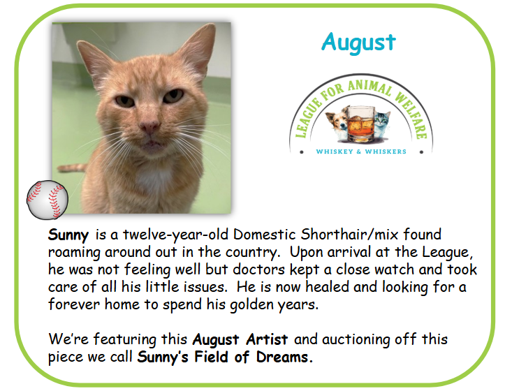 Sunny is a twelve-year-old Domestic Shorthair/mix found roaming around out in the country. Upon arrival at the League, he was not feeling well but doctors kept a close watch and took care of all his little issues. He is now healed and looking for a forever home to spend his golden years. We’re featuring this August Artist and auctioning off this piece we call Sunny’s Field of Dreams.