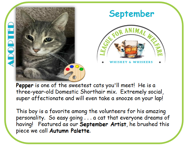 Pepper is one of the sweetest cats you'll meet! He is a three-year-old Domestic Shorthair mix. Extremely social, super affectionate and will even take a snooze on your lap! **Adopted** This boy is a favorite among the volunteers for his amazing personality. So easy going . . . a cat that everyone dreams of having! Featured as our September Artist, he brushed this piece we call Autumn Palette.