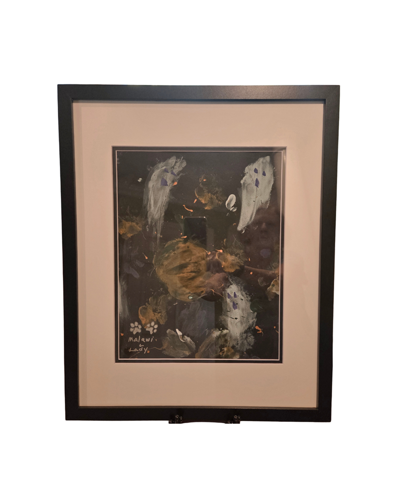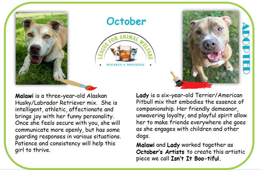 Malawi is a three-year-old Alaskan Husky/Labrador Retriever mix. She is intelligent, athletic, affectionate and brings joy with her funny personality. Once she feels secure with you, she will communicate more openly but has some guarding responses in various situations. Patience and consistency will help this girl to thrive. Lady is a six-year-old Terrier/American Pitbull mix that embodies the essence of companionship. Her friendly demeanor, unwavering loyalty, and playful spirit allow her to make friends everywhere she goes as she engages with children and other dogs. **Adopted** Malawi and Lady worked together as October’s Artists to create this artistic piece we call Isn’t It Boo-tiful.