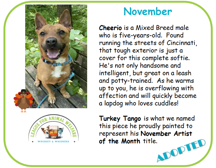 Cheerio is a Mixed Breed male who is five-years-old. Found running the streets of Cincinnati, that tough exterior is just a cover for this complete softie. He's not only handsome and intelligent, but great on a leash and potty-trained. As he warms up to you, he is overflowing with affection and will quickly become a lapdog who loves cuddles! **Adopted** Turkey Tango is what we named this piece he proudly painted to represent his November Artist of the Month title.