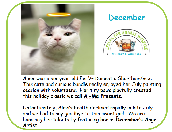 Alma was a six-year-old FeLV+ Domestic Shorthair/mix. This cute and curious bundle really enjoyed her July painting session with volunteers. Her tiny paws playfully created this holiday classic we call Al-Ma Presents. Unfortunately, Alma’s health declined rapidly in late July and we had to say goodbye to this sweet girl. We are honoring her talents by featuring her as December’s Angel Artist.