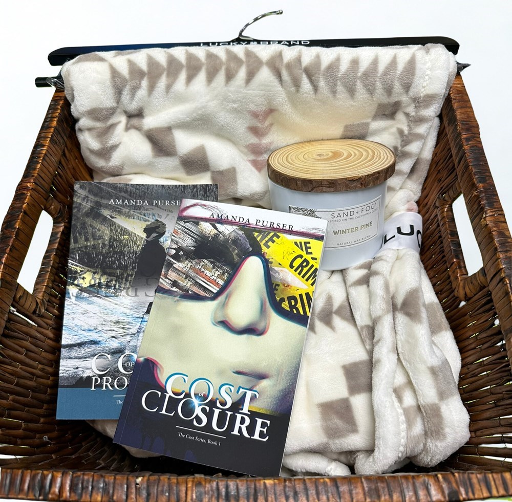 Curl up with a thrilling read and cozy comforts in this enticing package: The Cost Series, Books 1 & 2 - Signed by author Amanda Purser – Dive into the gripping noir crime adventures of Detective Raymond Townes. In Book 1, Townes fights his addictions, impulsive nature, and inner cynic while tracking a serial rapist unnoticed in his Louisiana parish. Book 2 follows Townes and Dr. Gaston as they struggle with haunting memories, turbulent pasts, and the strain of keeping their relationship afloat amid personal battles. A must-read for fans of suspense and psychological drama. Lucky Brand Throw Blanket – Stay warm and cozy while immersing yourself in the story. Sand & Fog Winter Pine Candle – Fill your space with a comforting, seasonal aroma as you read. Bid now for the perfect combination of suspense, comfort, and relaxation!