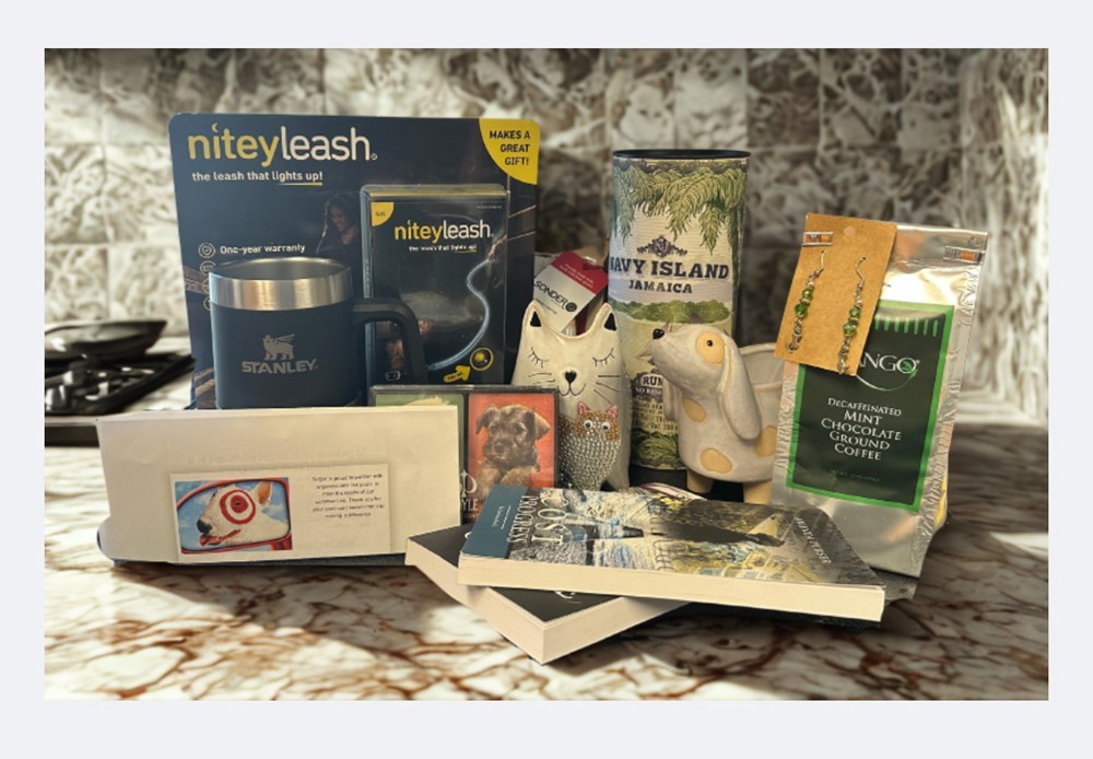 These are a few of my favorite things… for you! -Navy Island Jamaican Rum -Stanley Beer Stein -$50 Target Gift Card -The Cost Series books 1&2 -Frango Mint Chocolate Ground Coffee -Dog and Cat Planters -NiteyLeash -Dog theme Playing Cards -Homemade Sonder Dog Treats